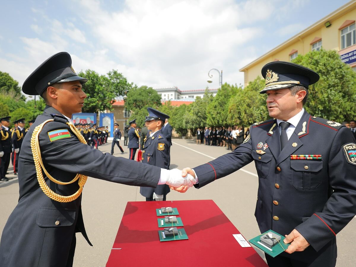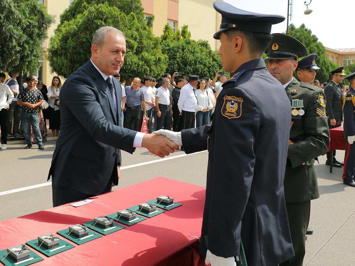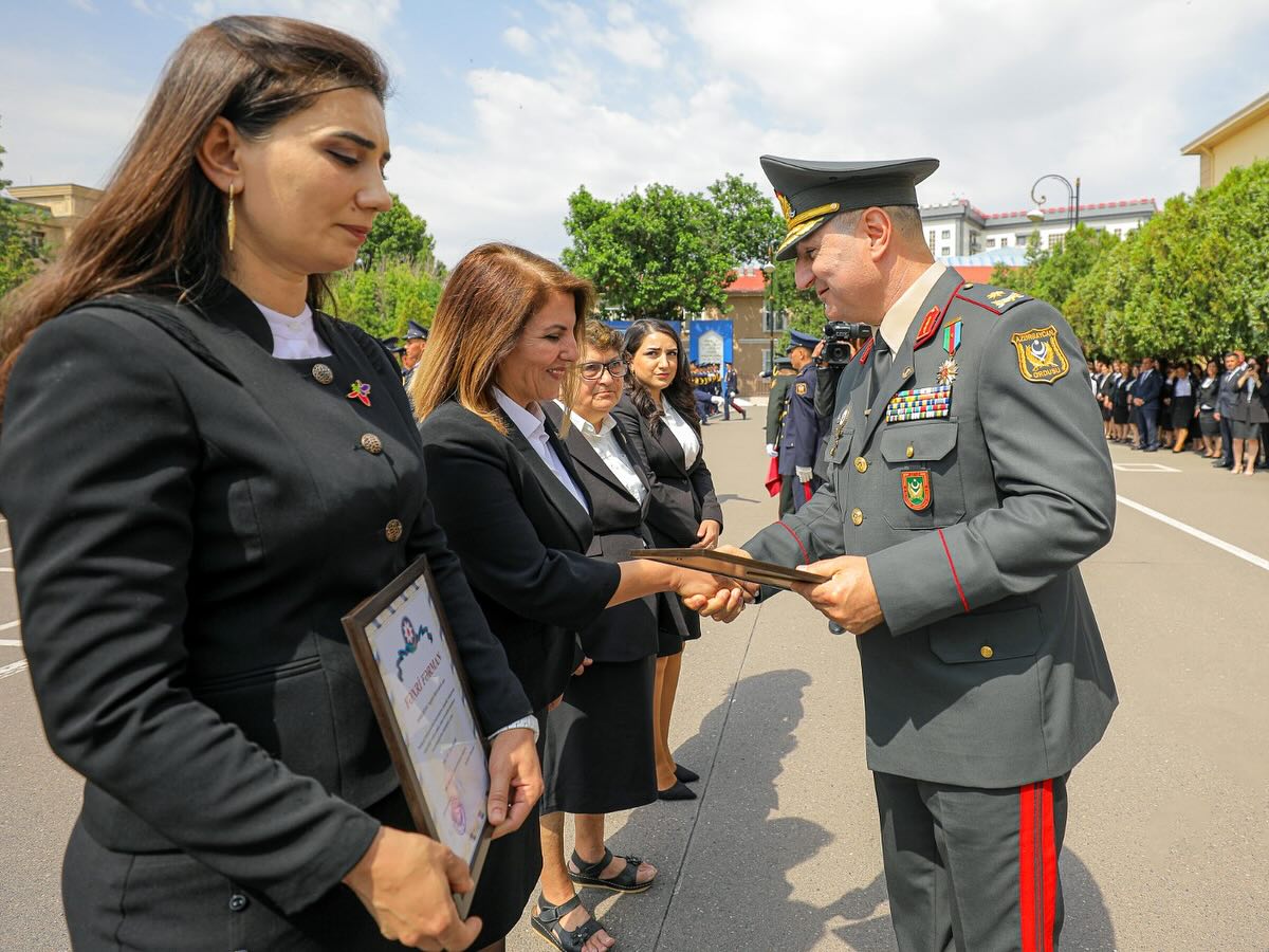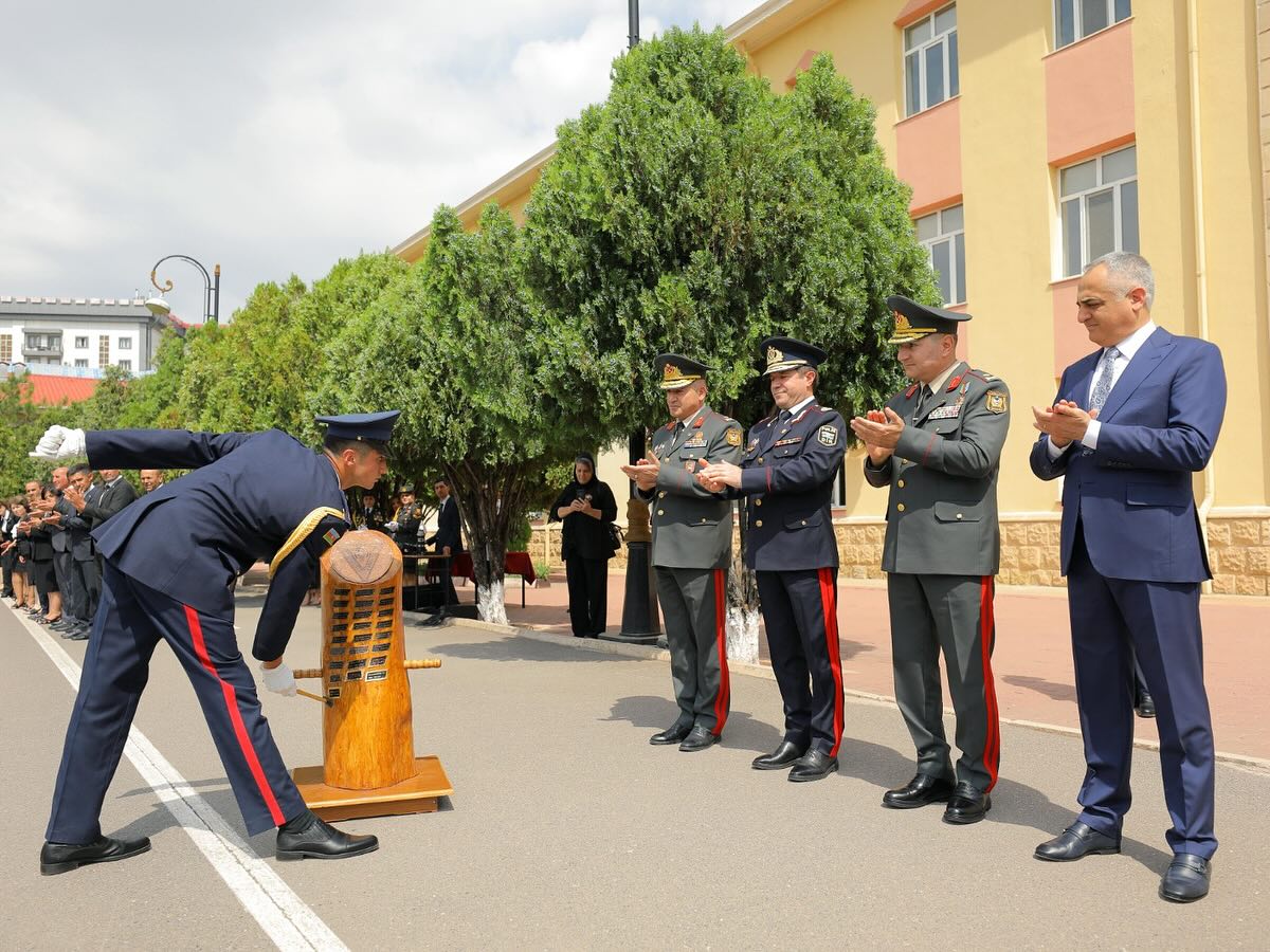 Daha sonra kursant Fərid Abbasov təhsil ocağının rəmzi kötüyünə 2025-ci ilin xatirə lövhəsini vurduqdan sonra döyüş bayrağı növbəti buraxılışın kursantlarına təhvil verilib.